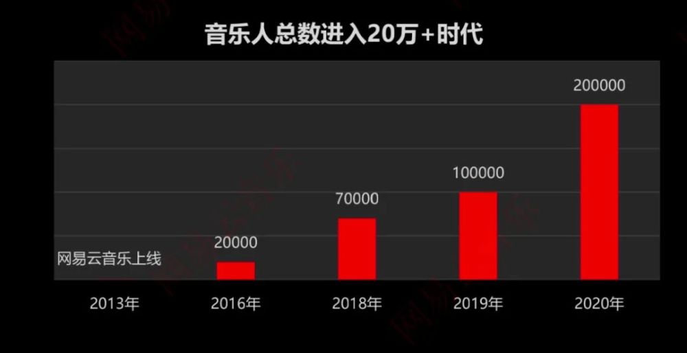 统计数据称,今年10月,入驻网易云音乐的音乐人总数已超 20 万。相比16年的2万人次,四年时间,这个数量级翻了10倍;而对比19年,今年一年就火速新增了约10万音乐人,更多年轻人开始有机会和条件涌入此行业。