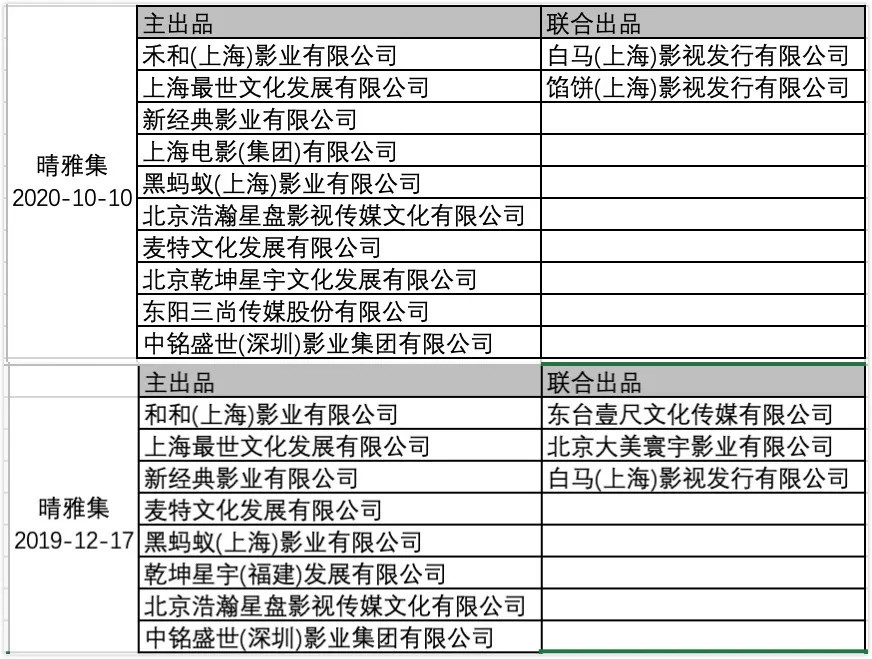 去年末,业内还流传着《晴雅集》释出份额的消息。对比去年12月与今年10月发布海报的出品方信息,有人退出,也有人跟进。