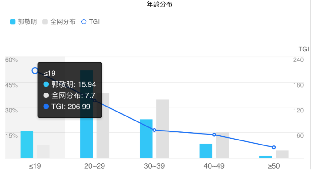 百度指数显示,郭敬明在“≤19岁”的00后受众中TGI指数最高。TGI(Target Group Index)指数反映的是,目标群体在特定研究范围(如地理区域、人口统计领域、媒体受众、产品消费者)内影响力的强弱程度,指数越高影响力越强。