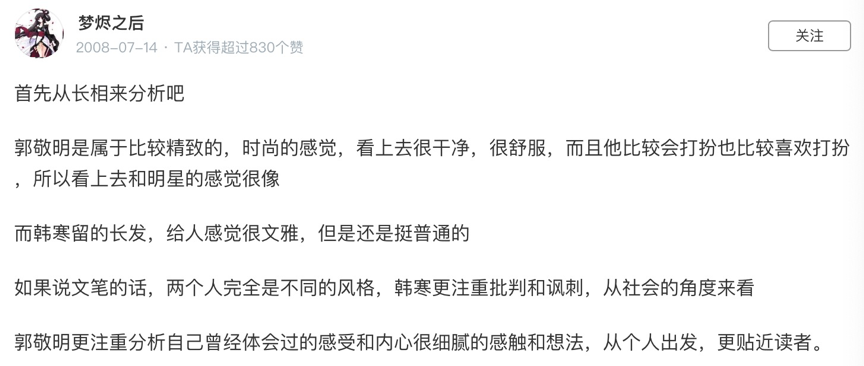硬糖君随机采访身边一位24岁的郭敬明粉丝,她自称是“惜才的理智粉”,认为郭敬明拥有想象力的才华,她会一直看郭敬明的小说和影视作品,但不想看他参加综艺,过度消费自身话题。