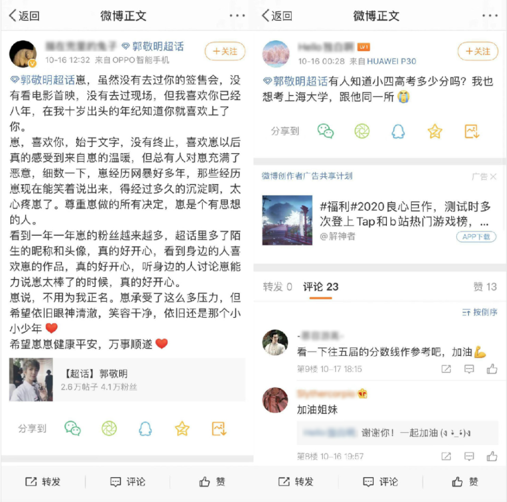 有人亲昵的称郭敬明为“崽”,这是饭圈妈妈粉最爱的称呼,还说自己是在10岁出头就喜欢上郭敬明,喜欢了八年。还有一个说要和郭敬明考同一所大学,问上海大学分数线。