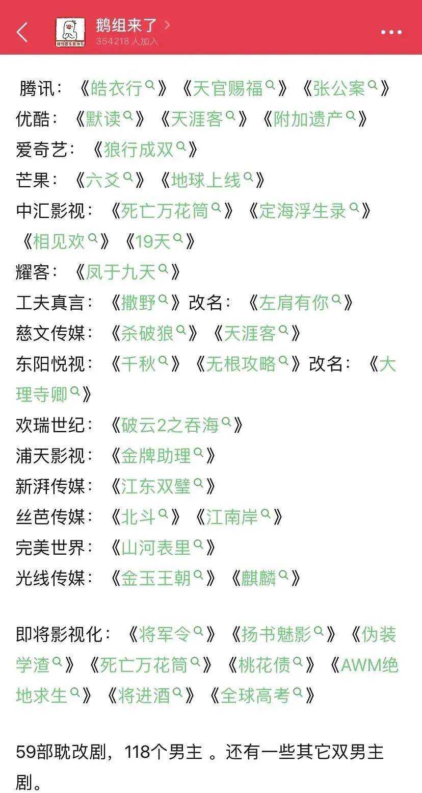《镇魂》《陈情令》《鬓边不是海棠红》的接连火爆再次证实了腐女经济的巨大商业效益,于是乎,耽改剧成了制作公司和平台的兵家必争之地。据豆瓣小组“鹅组来了”某用户统计,现已有59部耽改剧被提上制作日程,而在已经官宣主演阵容的剧集里,出现在腾讯视频2021大剧片单上《皓衣行》《张公案》《杀破狼》最为吸睛。