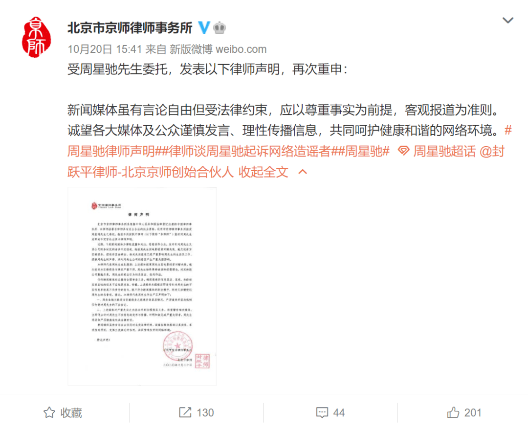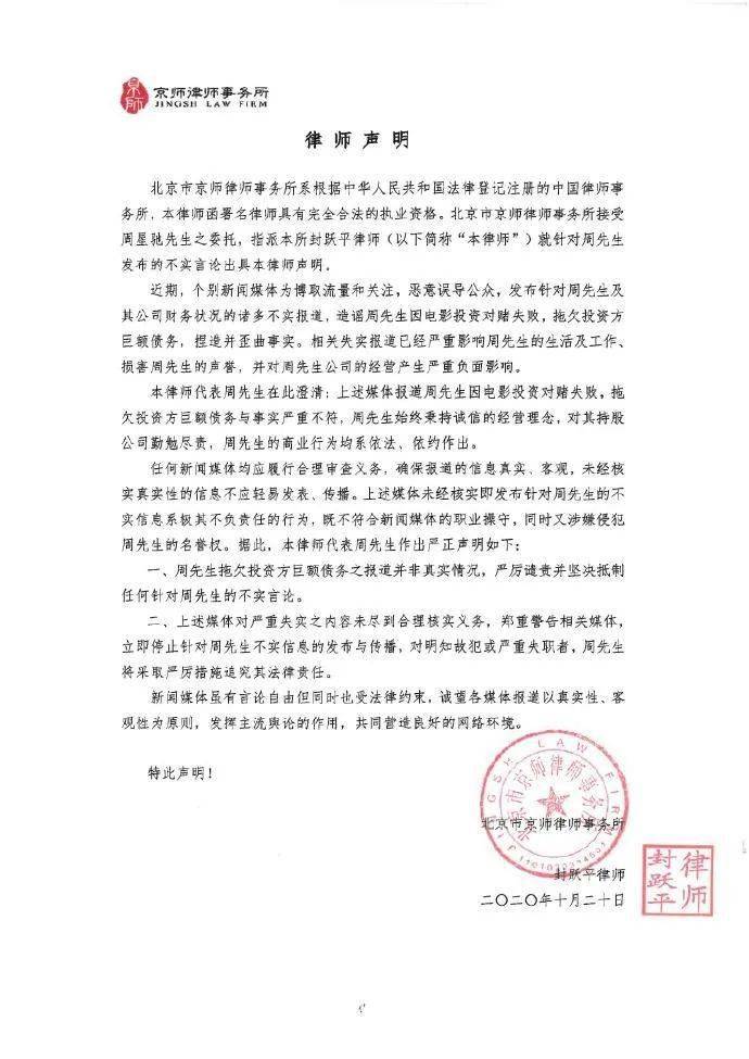 不过,据齐鲁晚报报道,10月20日,北京市京师律师事务所称其接受周星驰委托发布律师声明,称周星驰拖欠投资方巨额债务的报道并非真实情况。声明中澄清,周星驰因电影投资对赌失败,拖欠投资方巨额债务与事实严重不符,周星驰始终秉承诚信的经营理念,对其持股公司勤勉尽责,周星驰的商业行为均系依法、依约作出。