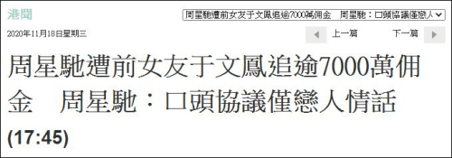 据环球时报11月19日报道,周星驰被前女友于文凤追讨7000万港元投资佣金一案,18日在中国香港(以下简称:香港)高等法院开审,引发港媒关注。