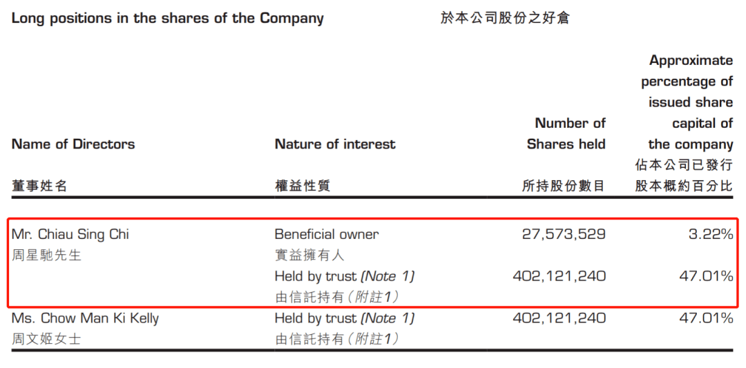 2010年5月,帝通国际更名为比高集团有限公司(Bingo Group Limited,8220.HK),并在香港创业板上市,彼时周星驰已成为该公司第一大股东,直接或间接持有35.64%的股份。之后他又多次收购股份,现已成为比高集团的绝对控股股东,据比高集团11月13日披露的2020/21财年中期报告显示,截至9月30日,周星驰直接或间接持有该集团已发行股份的50.23%。