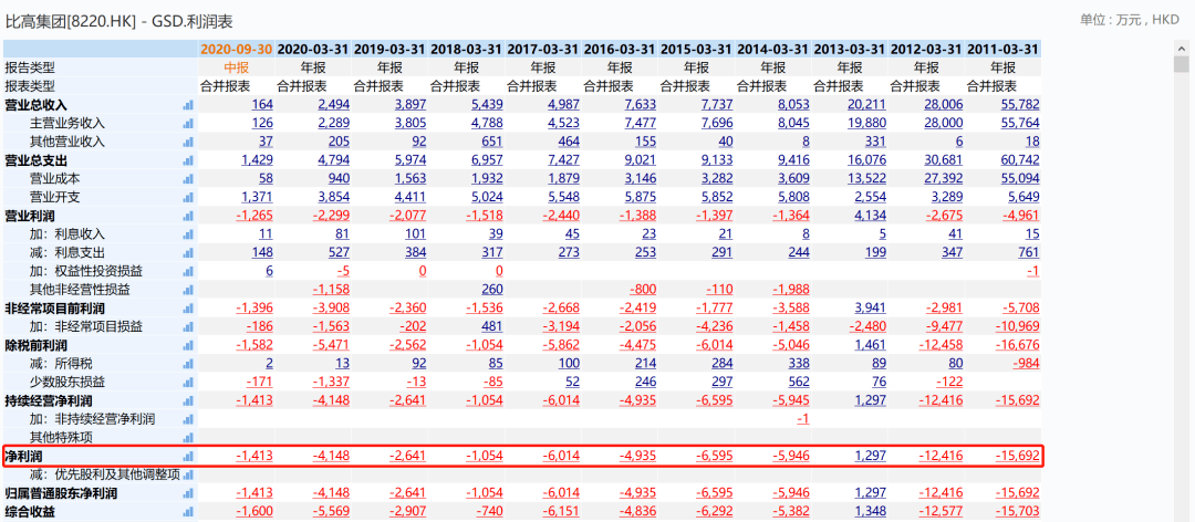 但比高集团连年亏损,入不敷出,股价已经跌到不足0.1港元。据比高集团近10年标准化报表(GSD)显示,该集团从2011年至今以来仅有2013年净利润达1297万元港元,其余年份均为负,近10年累计亏损近6亿港元。