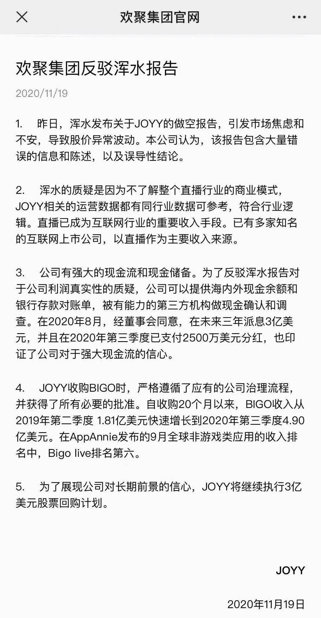 11月19日, 欢聚集团回应浑水做空报告称,浑水的报告充满了对直播行业和直播生态的无知,报告中逻辑不清、数据混乱、以偏概全,包含了大量的错误。接下来会有一场自证清白的漂亮反击吗?