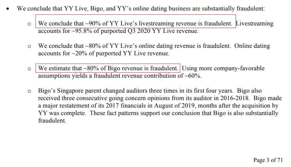 身为美国三大知名做空机构之一的浑水,选择在这个关键时刻,给予百度和欢聚一记又快又狠的重击:11月19日,浑水在社交媒体上发布报告,经过一年多的研究,包括通过自动化收集1.156亿笔交易,进行宏观数据收集和分析,以及审查文件和账目、秘密实地调查等方式, 得出欢聚直播业务90%收入为假,海外版Bigo Live 80%收入造假,在线交友收入80%造假,涉及金额达数十亿美元的结论。