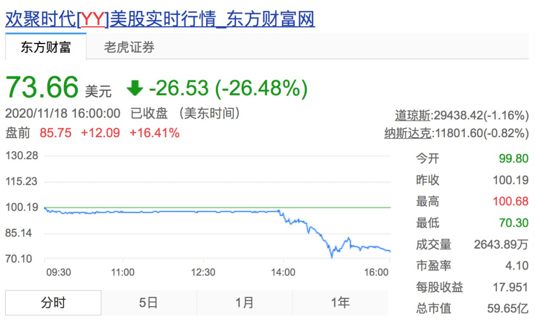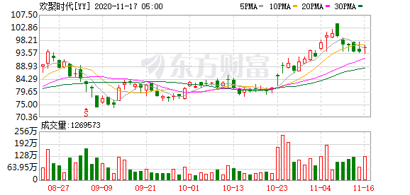 11月17日,百度与欢聚集团同日发布财报,官宣这场联姻:百度将以约36亿美元现金(根据协议或有对价调整)收购欢聚国内视频娱乐直播业务(YY直播),包括但不限于YY移动应用、YY.com网站、YYPC客户端等,预计在2021年上半年完成交易。消息一出,欢聚集团(Nasdaq:YY)股价周二收涨4.82%,报100.19美元。11月17日(周二)美股盘前,欢聚(YY.US)股价大涨,截至20:03,该股涨8.31%,报103.52美元。
