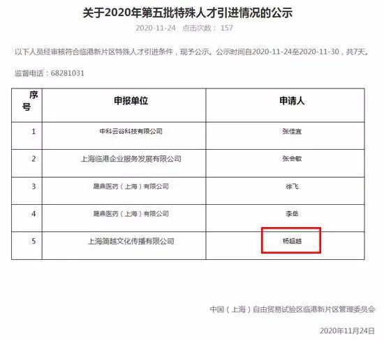 近日上海自贸区临港新片区管委会官网公布一份《2020年第五批特殊人才引进情况的公示》名单,上面除了一些普通人不知道的企业和名字之外,还有杨超越,引起了巨大的争议,一度冲上微博热搜。