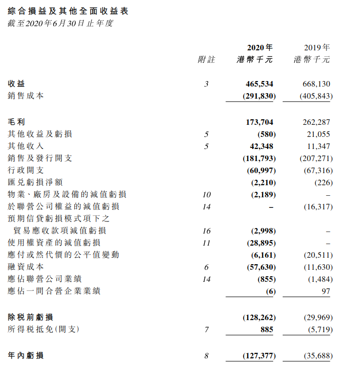 受疫情影响传递娱乐在过去的一年业绩并不理想。截止6月30日的2020年财报数据显示其实现营业收入4.66亿港元,同比2019财年的6.69亿港元大幅下降;年内亏损1.27亿港元,相比较于2019财年的0.36亿港元大幅上升。