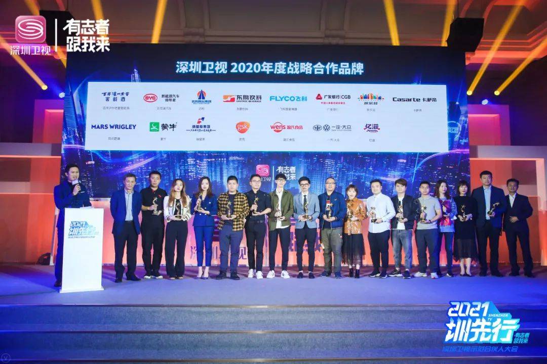 (深圳广电集团党组副书记、总编辑苏会军;集团党组成员、市纪委监委驻集团纪检监察组组长 陶续良为“深圳卫视2020年度战略合作品牌”颁发荣誉奖杯)