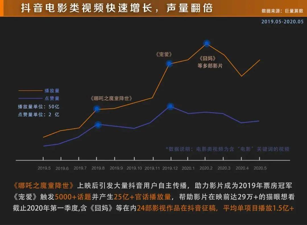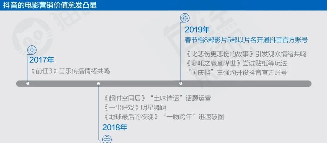 以上是猫眼直播宣发领域的最新成果,而在短视频宣发领域,猫眼与抖音近期的资源耦合,或将为电影宣发未来一段时间的发展提供新思路。