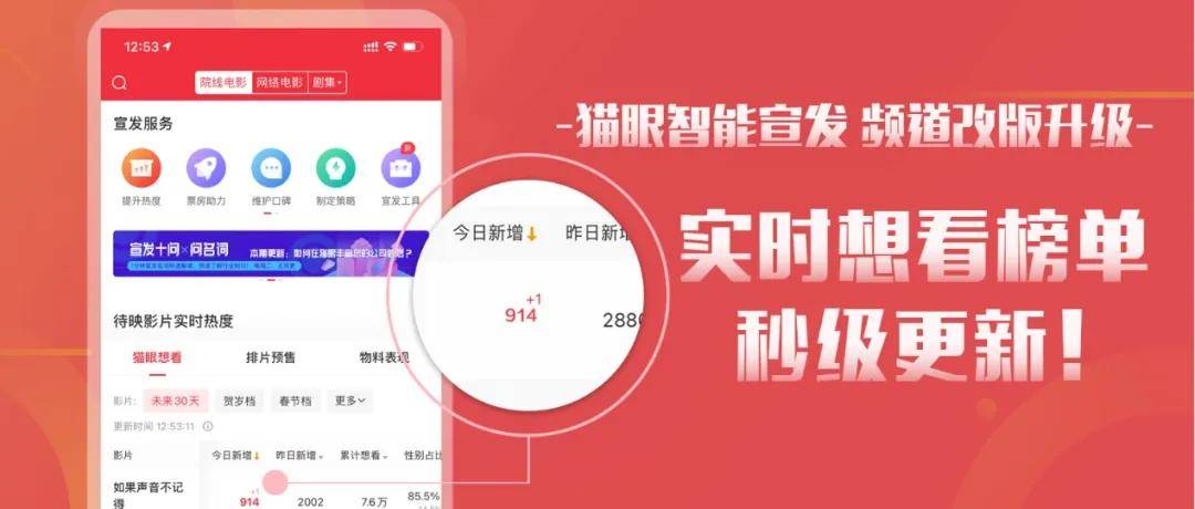 这一更新是基于猫眼“想看”与宣发策略制定间的强关联。此次升级后,一来帮助业内人士及时掌握影片的热度信息、实时数据参考,二来为宣发提供更清晰与更具靶向性的指导,行业价值重大。