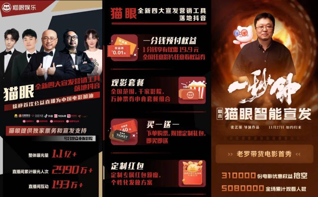 8月15日,猫眼在抖音发起了“再一起,看电影”公益直播活动,徐峥、张一白、谭卓等影视大咖空降抖音直播间,带动3700余家影院产生订单,以及拉动暑期档18部影片的售票。其中,一分钱预付权益、超值观影套餐、购票买赠、定制红包等四项宣发功能打出一波营销组合拳,成为猫眼直播宣发领域的又一宣发路径创新。