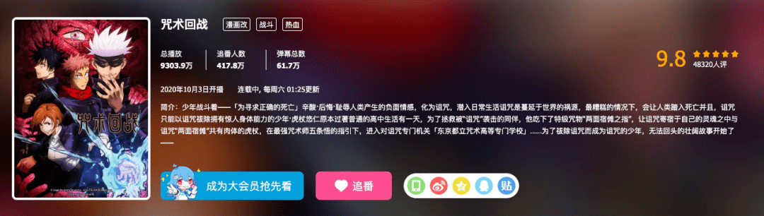 而 这40部中B站引进了36部,其中23部作品独播,13部与优爱腾合播。目前打开B站新番区,10月热度最高的新番《咒术回战》播放量超过9300万,追番人数达到417.8万。