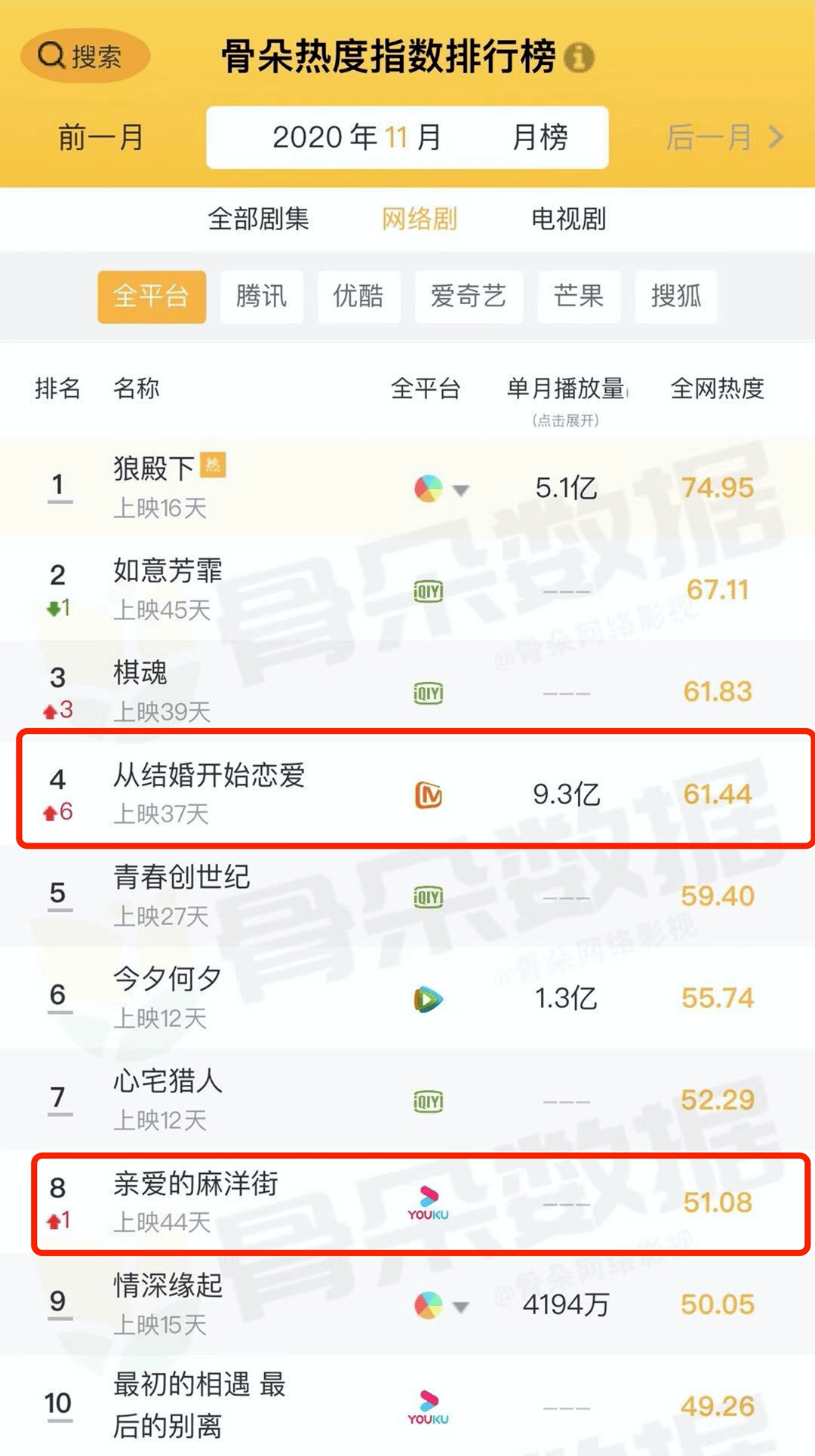 前有腾讯视频、爱奇艺的来势凶猛,对于激流勇进的优酷,芒果TV来说,此时在剧集上的布局较为相似,同样是甜宠、悬爱两手抓,自制大剧依旧缺位。11月份,芒果TV的《从结婚开始恋爱》成为圈层小爆款,在骨朵月榜上排名第四位,而与《以家人之名》略撞型的优酷的《亲爱的麻洋街》则没有取得理想中的成绩,在月榜上排名第八位。