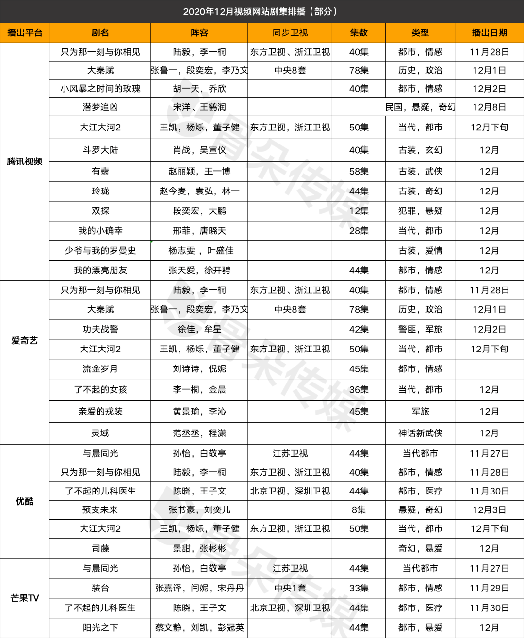 另外,优酷的《上游》《绝世千金2》《十二谭》《清落》,芒果TV的《舒克与桃花》《青春须早为》也有望在12月与观众见面。还有一个月的时间就要准备迎接跨年,这期间的变数仍然很大,在一片暗流涌动中,有突如其来的黑马杀出,也未可知。
