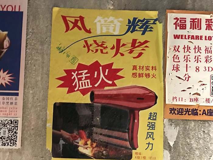 在过道上,依然能看到风筒辉烧烤的小广告。(图片拍摄:吴容)