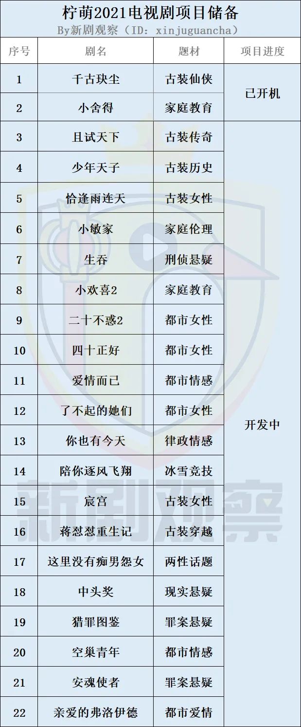柠萌当前共拥有22部电视剧项目储备,包括两部已开机剧目《千古玦尘》《小舍得》,以及20部开发中项目《且试天下》《少年天子》《恰逢雨连天》《小敏家》《生吞》《小欢喜2》《二十不惑2》《四十正好》《爱情而已》《了不起的她们》《你也有今天》《陪你逐风飞翔》《宸宫》《蒋怼怼重生记》《这里没有痴男怨女》《中头奖》《猎罪图鉴》《空巢青年》《安魂使者》《亲爱的弗洛伊德》。