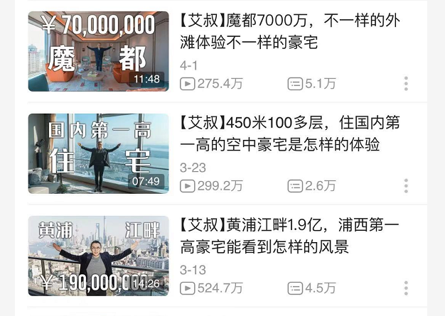 男女爱好有车包之分,但总有一件事上能达成统一:房。以解说豪宅为卖点的小艾大叔,就是一网打尽型的炫富博主。