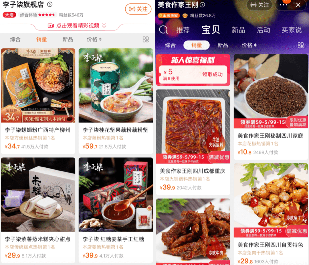 另一类带货网红,则活跃在B站这些中长视频平台上,美食作家王刚和李子柒都是代表。在合适的时机下,两人分别开了淘宝店铺。王刚基本是单打独斗,李子柒背后有MCN机构帮其运营,差别是李子柒拥有更优质和高效的供应链,其店铺无论是粉丝数还是销量都远超王刚。