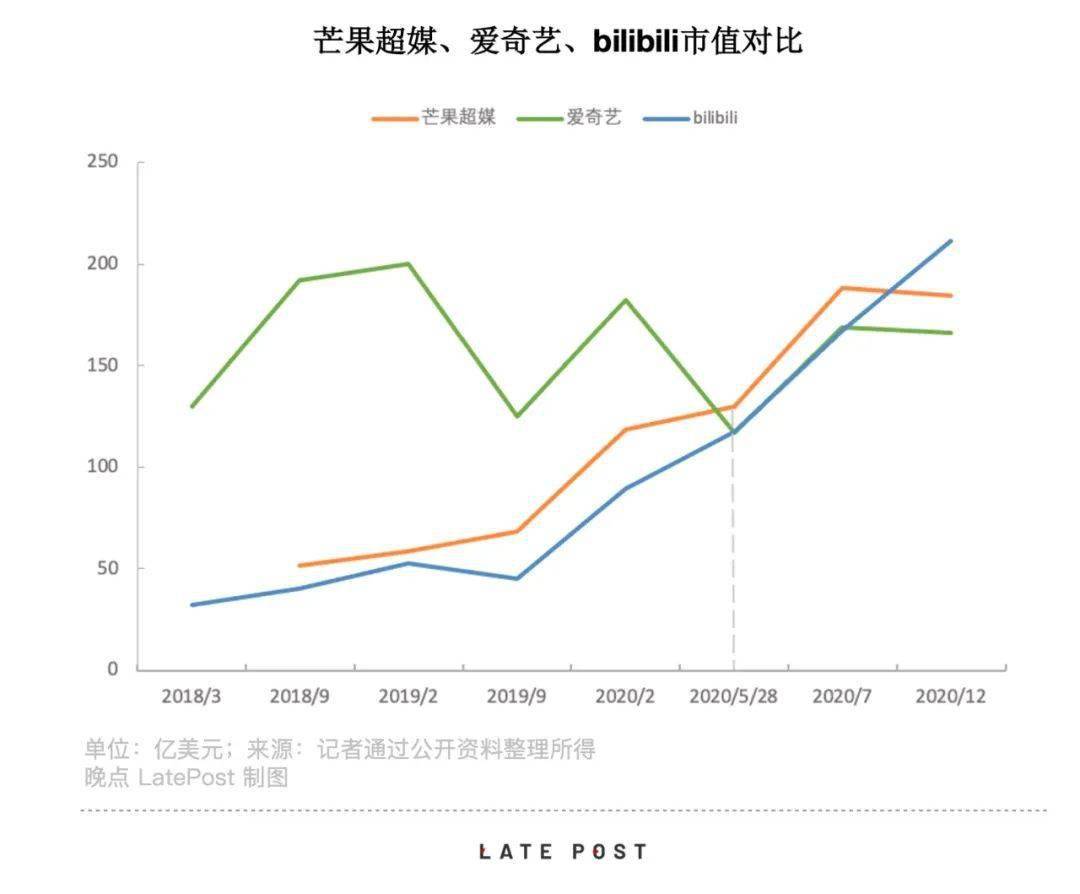 一位知情人士告诉《晚点 LatePost》,讨论方案中针对 B 站的交易估值在 100 亿美元左右,而 B 站当时的实际市值为 65 亿美元上下。一年后,B 站市值已经越过 220 亿美元,超越了爱奇艺的 166 亿美元。
