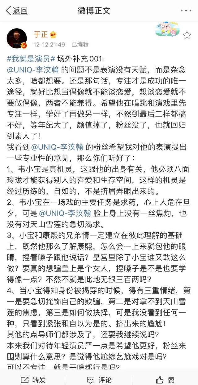 于正就是为节目首期夺下热搜榜的首席狙击手,通过镜头内外、线上线下积极开嘴炮,与李汶翰产生三重摩擦,表演类节目关于偶像跨界那些事儿,都借着于正这张嘴给聊透了。