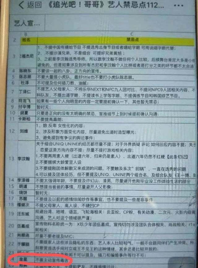 此前坊间流传着《追光吧!哥哥》各位明星嘉宾的话题规避点图片,金星一栏后写着“不要主动宣传毒舌”。