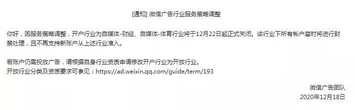 因服务策略调整, 开户行业为自媒体—财经、自媒体—体育行业将于12月22日起正式关闭。该行业下所有账户届时将进行封禁处理,且不再支持新账户从上述行业准入。