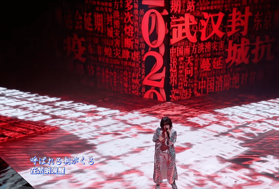 一幕是陈乐一翻唱《新世纪福音战士》主题曲时,背景屏幕里划过的红字,组成了2020的大事记。