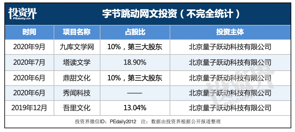 2019年至今,除去掌阅科技,字节跳动已经投资了吾里文化、秀闻科技、鼎甜文化、塔读文学、九库文学网五家网文公司。2020年7月,字节跳动还与中文在线围绕音频作品授权使用达成长久业务合作。这可以视为字节为切入内容领域建立的桥头堡。