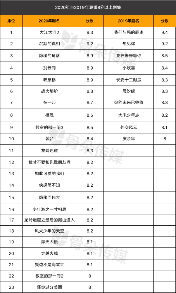 对于国剧来说,2020年的确不寻常,当骨朵总结出来一系列关键词之后,还发现了另外一个值得关注的大事件,那就是2020年豆瓣8分以上的国产电视剧,共有23部,比2019年增长了13部,创下近年来8分以上剧集最多的记录。