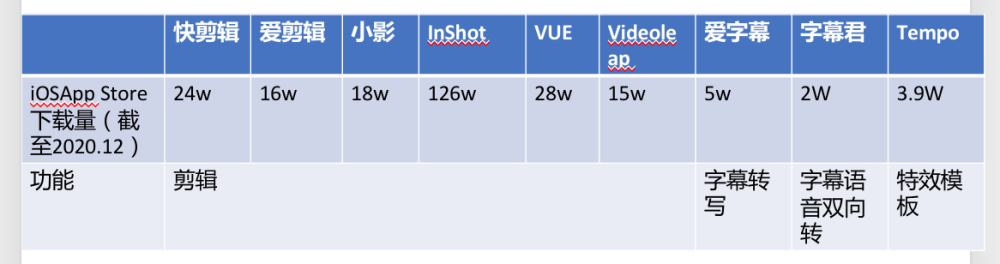 但很多大厂也是心有余而力不足。可以以iOS App Store为例(截至2020年12月)来看各剪辑软件的受欢迎程度:抖音的剪辑软件剪映的下载量为400万;抖音“好朋友”,快手的快影下载量仅为72万,已经相差了一个数量级;B站亲儿子必剪下载量仅为2628,腾讯秒剪的下载量因为288。是的你没看错,2628和288后面都没有加万,就只是千人级别和百人级别。