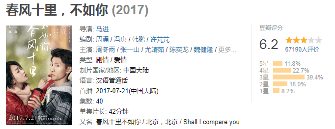 然而从行业已有案例来看,电影咖想从大银幕成功转型小荧屏并不容易,大都遭遇“水土不服”。当红花旦周冬雨,从《山楂树之恋》中出道,此后在《七月与安生》《少年的你》等多部电影中均有出色表演,截至目前已累计创造了95.95亿元的票房,但其出演的电视剧《麻雀》《春风十里不如你》反响平平,豆瓣评分刚刚迈过及格线,分别为:6.8分和6.2分。