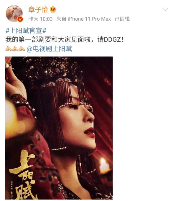 1月7日,章子怡在其微博上为自己的“第一部剧”《上阳赋》打call宣传,引来佟丽娅、张艺兴、袁弘、苏芒等众多演艺界和时尚界名人前来留言支持。