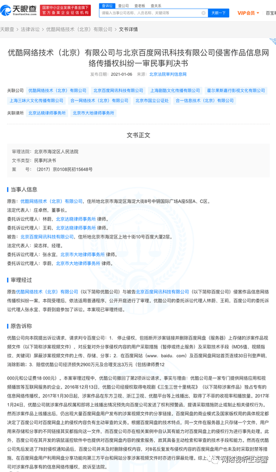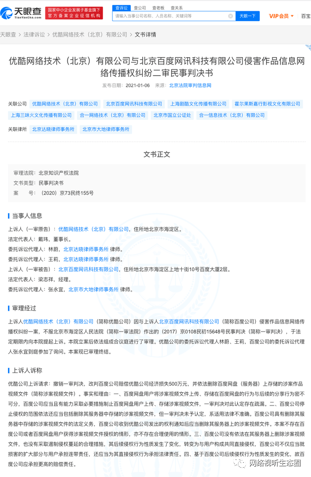 天眼查App显示,1月6日,优酷网络技术(北京)有限公司与北京百度网讯科技有限公司侵害作品信息网络传播权纠纷二审民事判决书公布,案号为(2020)京73民终155号,上诉人(一审原告)为优酷网络技术(北京)有限公司,上诉人(一审被告)为北京百度网讯科技有限公司。