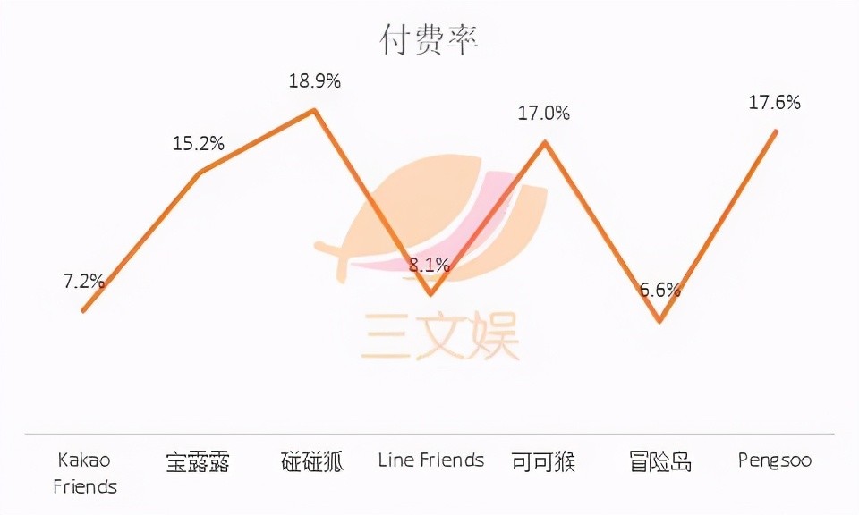 周边产品购买率方面,付费率最高的角色为碰碰狐18.9%,其次是Pengsoo17.6%、可可猴17.0%、宝露露15.2%、Line Friends8.1%、Kakao Friends7.2%、冒险岛6.6%。