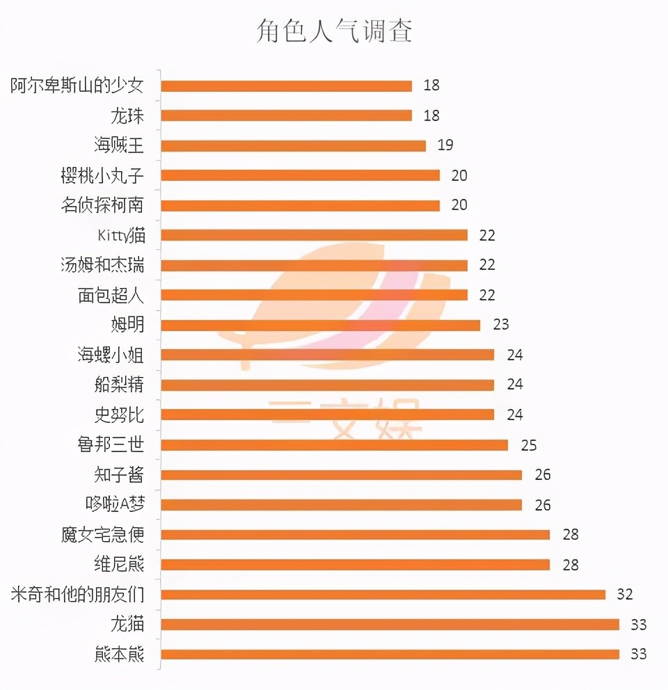 从该调查结果中可以看出,入榜前20位的人气角色中有11个都是日本的动画或漫画作品,占比高达55%,非日本作品的人气角色在动画作品中占比25%,以迪士尼出品居多。