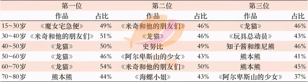 30~40岁最喜爱的角色为《米奇和他的朋友们》51%、《龙猫》46%、《玩具总动员》43%。