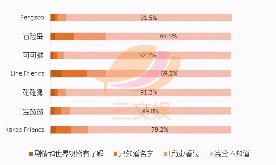 结果显示,韩国角色在日本市场的平均认知度为16.9%,其中Line Friends(30.8%)、冒险岛(30.5%)、Kakao Friends(20.8%)位列前三,而其余4个角色的认知度均低于平均值。对于宝露露、碰碰狐、Pengsoo、可可猴有所了解的人大多是家中育有子女的人。