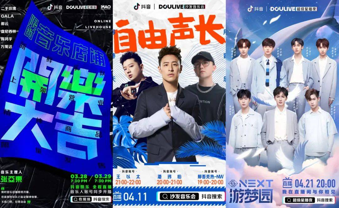 洞察到线上娱乐蓬勃发展的趋势后,抖音迅速推出了DOULIVE娱乐直播厂牌,致力于以专业化、IP化的直播内容服务于明星的线上营业,以DOULIVE直播厂牌下的“沙发音乐会”、“热播第一线”、“超级星播夜”、“在现场”四大子厂牌,从音乐、影视宣发、偶像、现场娱乐四大赛道覆盖艺人的多元化需求和合作广度。
