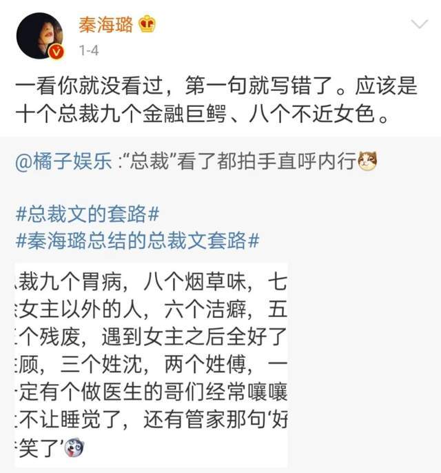 几天前,秦海璐总结的总裁文套路冲上热搜。