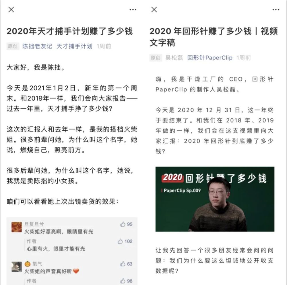 公众号“天才捕手计划”和自媒体“回形针”都选择了在2021年的第一周公布其账号的营收情况。