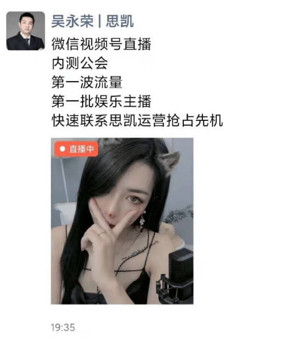 2020年12月30日晚,思凯文化CEO吴永荣在朋友圈转发了一条视频号直播链接,介绍自家秀场直播新业务的同时,开始对外招募主播和商家。