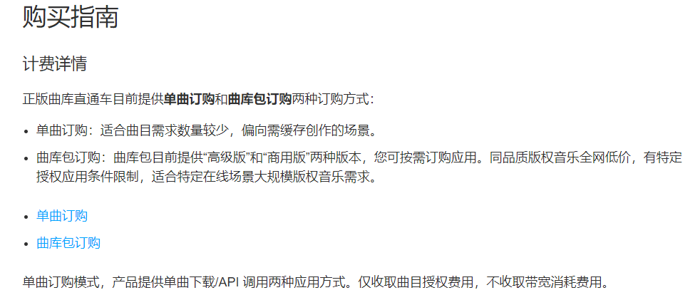 其二,正版音乐因涉及到词、曲、改编、播放等一系列权益,授权流程略微复杂,而正版曲库直通车则针对项目的不同应用场景、权益需要和接入需求,制定了清晰明确的产品规则,从而提升用户与版权方的链接效率。