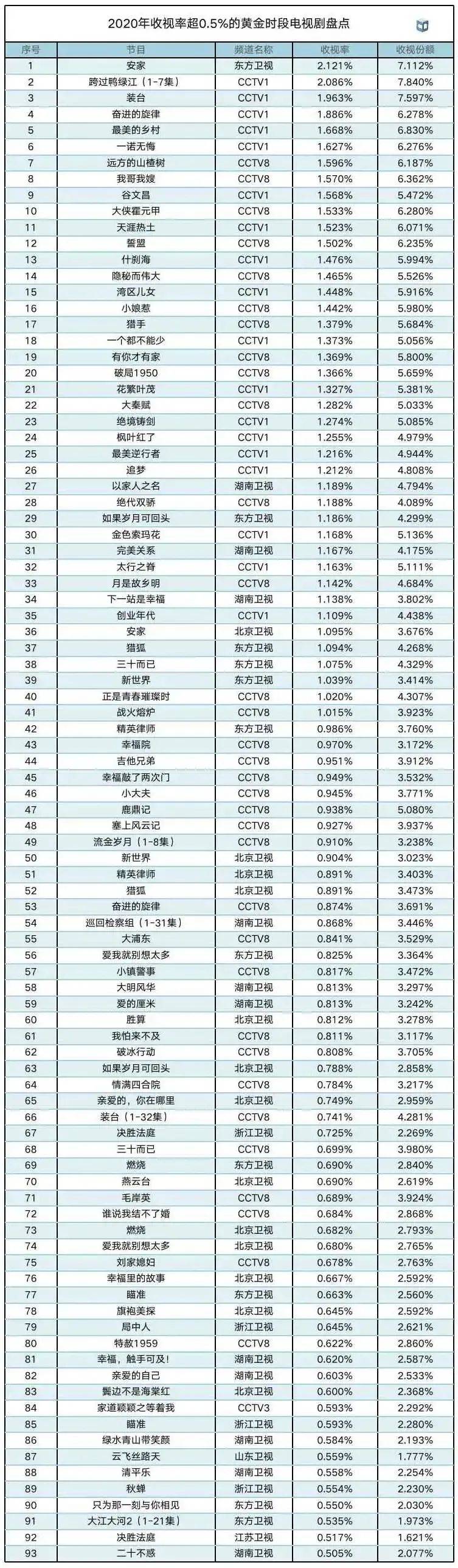 根据中国视听大数据,2020年收视率超0.5%的93部次黄金时段电视剧中,湖南、东方、浙江、江苏、北京、山东6家省级卫视一共才拿下40个席位,余下53部次电视剧,均出自CCTV 1、CCTV8。