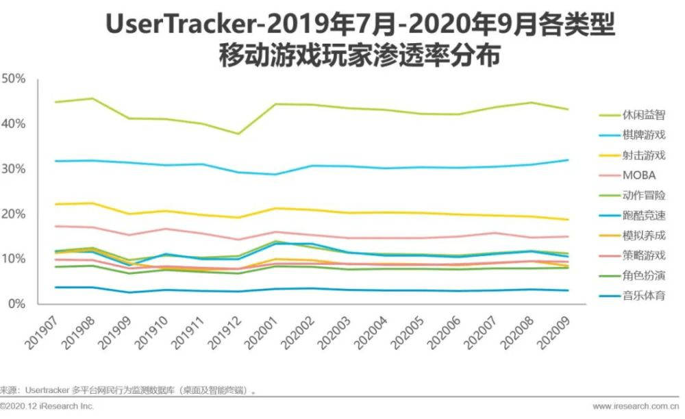 艾瑞分析数据也显示,2019年7月到2020年9月各类型移动游戏玩家渗透率分布中,休闲游戏和棋牌游戏仍保持前两位,表明中国游戏市场中仍存在大量的轻度玩家。