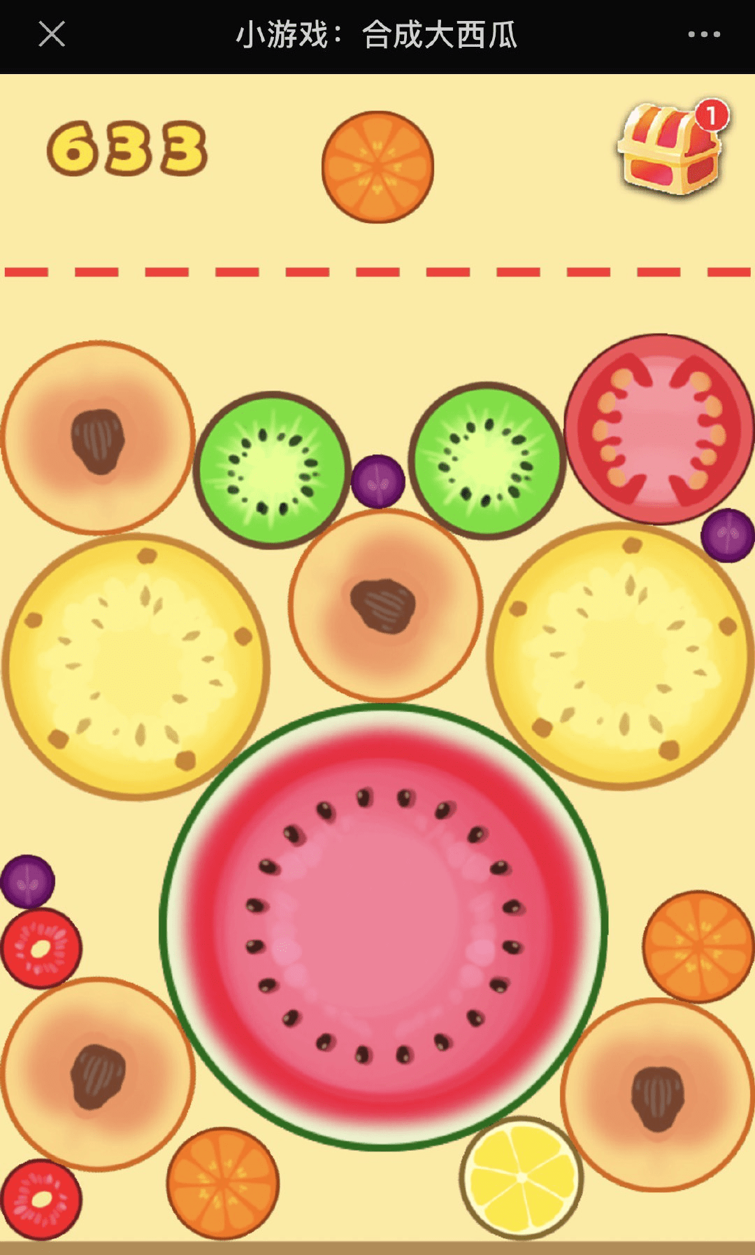 控制水果下落位置,碰撞合成。超简便的玩法几乎构成了《合成大西瓜》的全部。两个体型较小的水果相撞即可合成更大的水果,最终达到大西瓜形态。玩家可以手动控制水果从哪个地方下落。当瓜积累到一定高度,游戏就会结束。