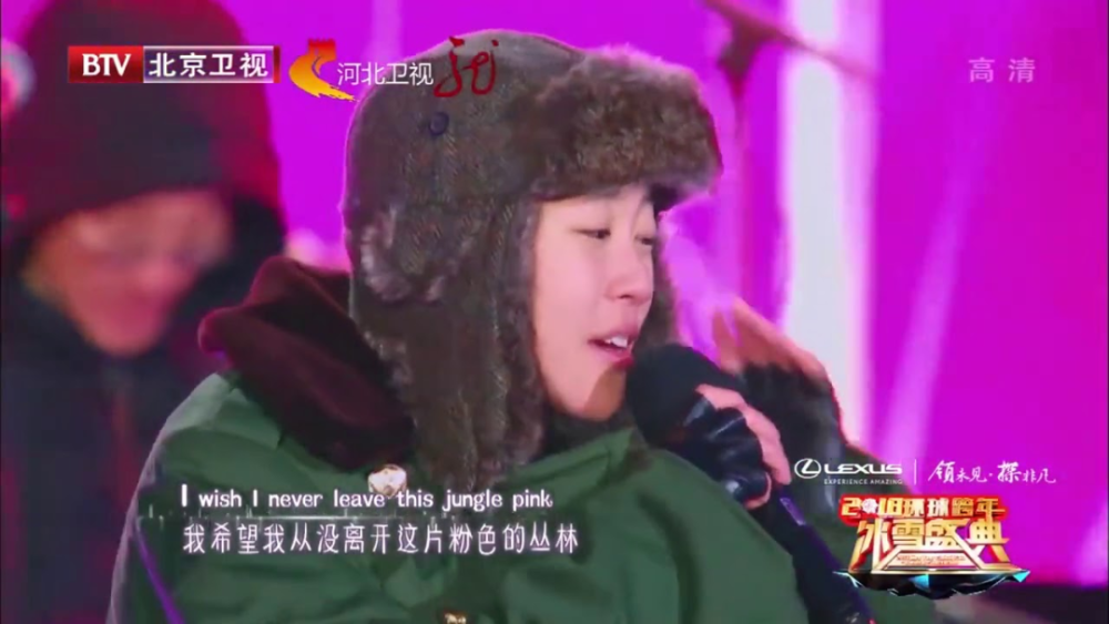 有北京卫视室外冰天雪地冒冷气,戴着雷锋帽的窦靖童冻得呲牙咧嘴裹紧军大衣。